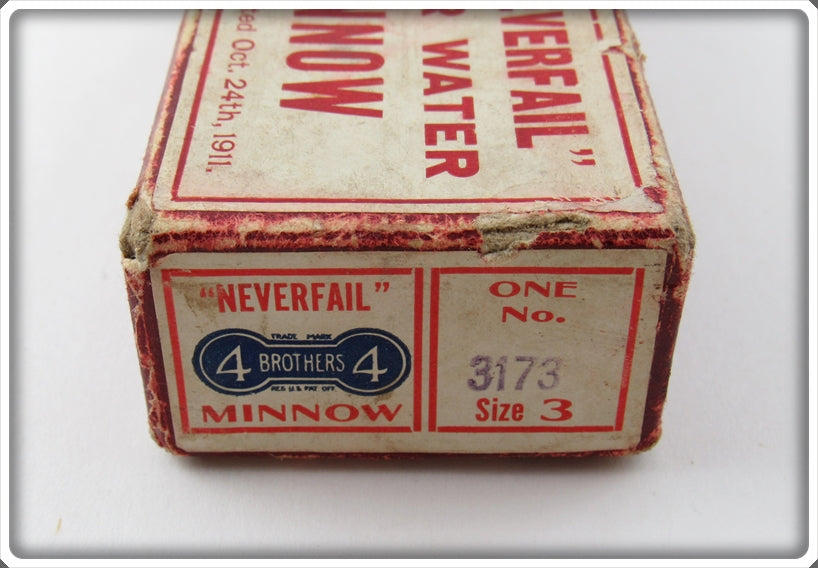 This is a nice old FourBrother Neverfail Under Water Minnow 4 Brothers lure # 3173 Size 3 that was sold on Tough Lures! Vintage and antique fishing lures are added for sale often so keep checking back! I buy old lures so feel free to contact me if you have any to sell.