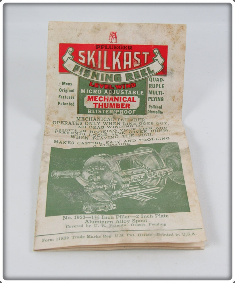 This is a nice old Pflueger Skillkast 1953 Level Wind Reel that was sold on Tough Lures! Vintage and antique fishing lures are added for sale often so keep checking back! I buy old lures so feel free to contact me if you have any to sell.