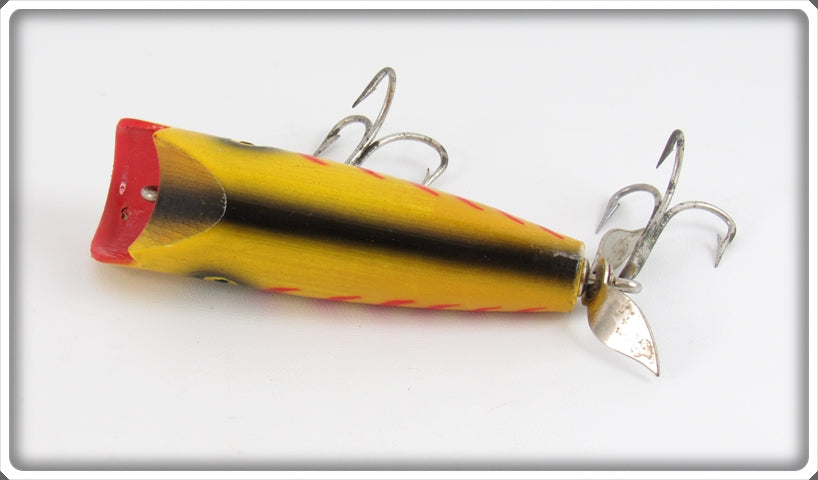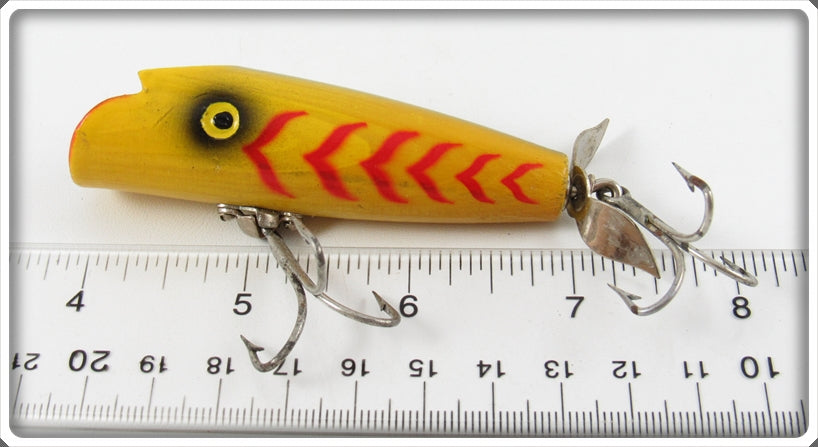 This is a nice old Pflueger Yellow Body Red Stripes Poprite lure # 8543 that was sold on Tough Lures! Vintage and antique fishing lures are added for sale often so keep checking back! I buy old lures so feel free to contact me if you have any to sell.