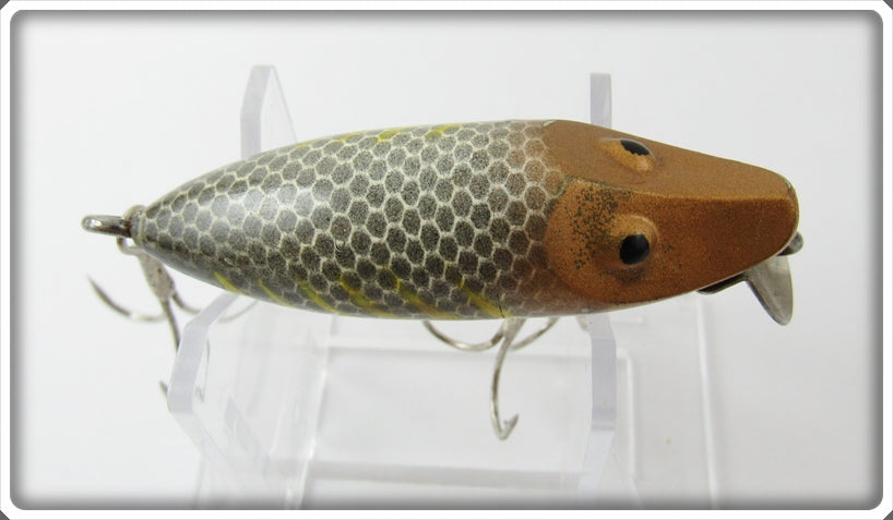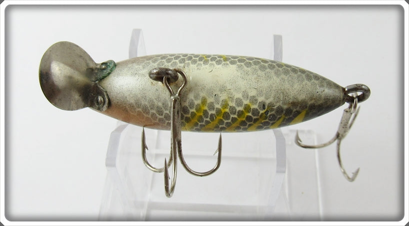 This is a nice old Rinehart Yellow Bar Silver Scale Gold Face Chubby lure that was sold on Tough Lures! Vintage and antique fishing lures are added for sale often so keep checking back! I buy old lures so feel free to contact me if you have any to sell.