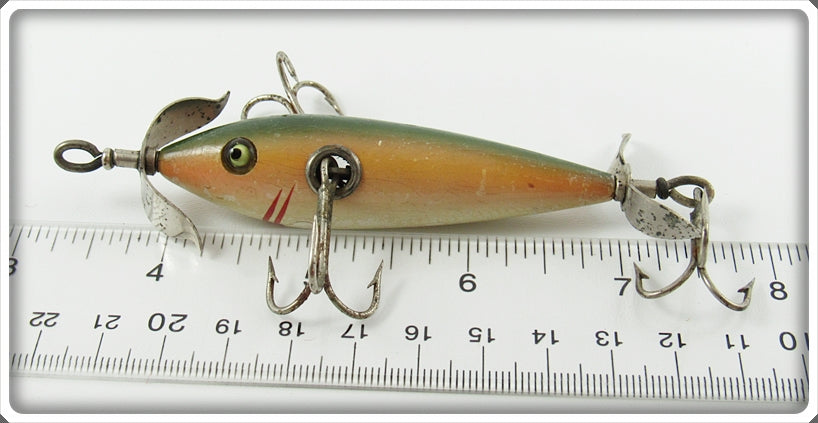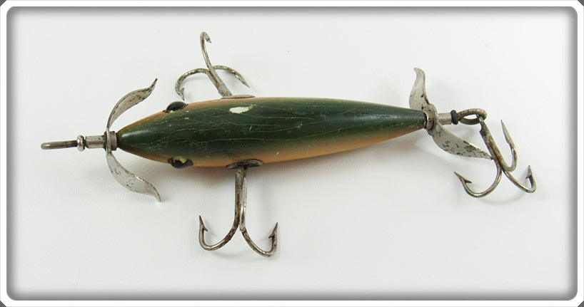 This is a nice old Shakespeare Green Back Underwater Minnow lure # 33 that was sold on Tough Lures! Vintage and antique fishing lures are added for sale often so keep checking back! I buy old lures so feel free to contact me if you have any to sell.