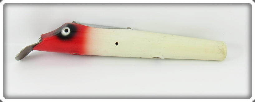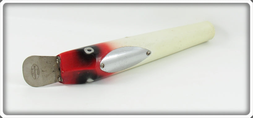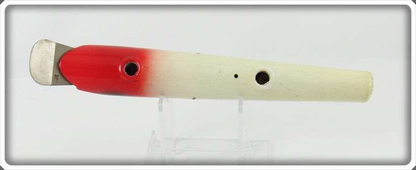 This is a nice old Shakespeare Red & White Wobbler Sample Board lure that was sold on Tough Lures! Vintage and antique fishing lures are added for sale often so keep checking back! I buy old lures so feel free to contact me if you have any to sell. This uncatalogued model looks like a cross between a Striped Bass Wobbler and a Kingfish Wobbler. It is 6" like the Striped Bass Wobbler but has a metal plate on the back like the Kingfish Wobbler but it has no fin.