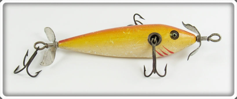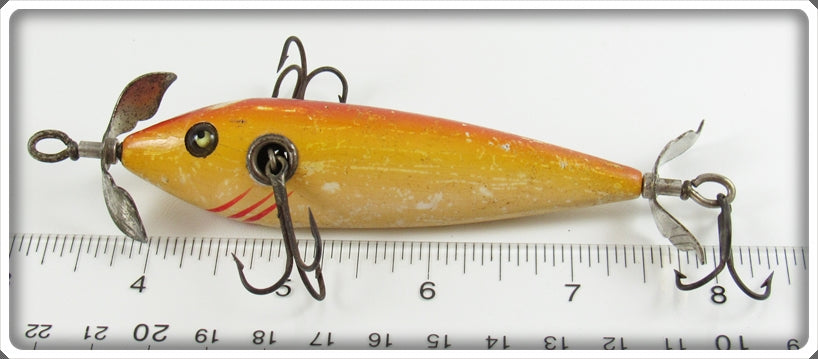 This is a nice old Shakespeare Yellow & Orange Back 33 Underwater Minnow lure that was sold on Tough Lures! Vintage and antique fishing lures are added for sale often so keep checking back! I buy old lures so feel free to contact me if you have any to sell.
