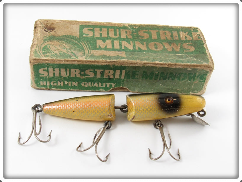 This is a nice old Shur Strike Shiner Scale Jointed Pikie lure that was sold on Tough Lures! Vintage and antique fishing lures are added for sale often so keep checking back! I buy old lures so feel free to contact me if you have any to sell.
