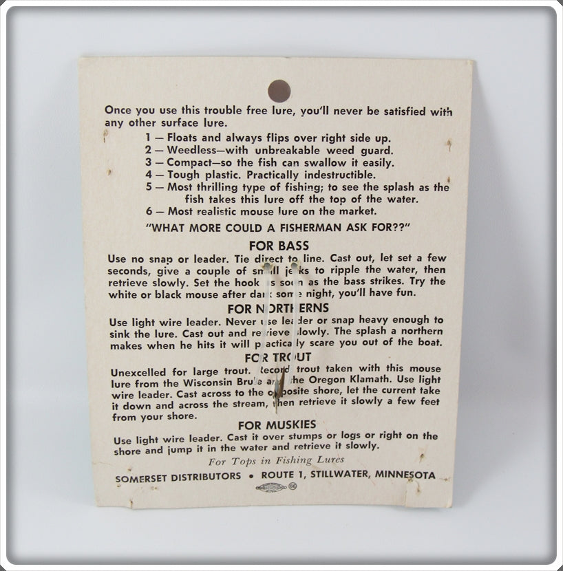 This is a nice old Somerset Distributors Grey Flocked Super Mouse lure that was sold on Tough Lures! Vintage and antique fishing lures are added for sale often so keep checking back! I buy old lures so feel free to contact me if you have any to sell.