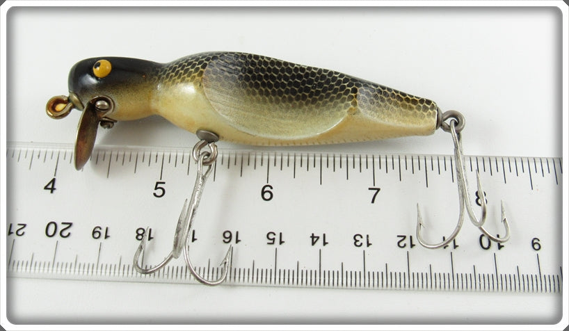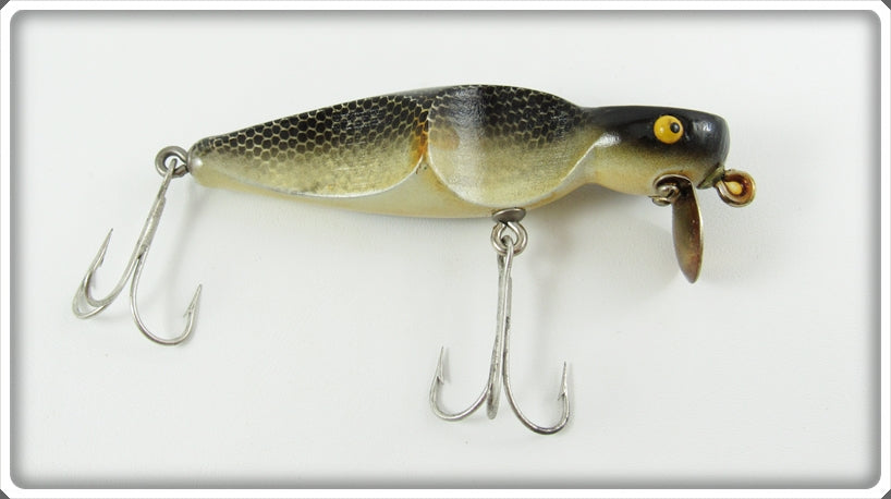 This is a nice old Southern Artificial Bait Co Black Scale Scalloped Wiggler lure that was sold on Tough Lures! Vintage and antique fishing lures are added for sale often so keep checking back! I buy old lures so feel free to contact me if you have any to sell.