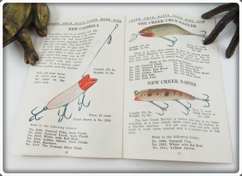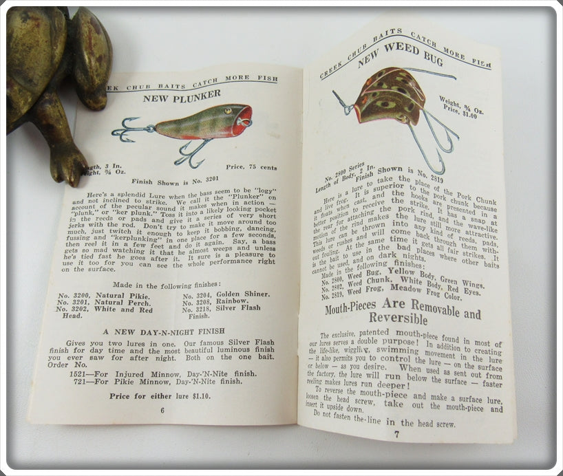 This is a nice old The Creek Chub Bait Co Old Fisherman Pocket Catalog that was sold on Tough Lures! Vintage and antique fishing lures are added for sale often so keep checking back! I buy old lures so feel free to contact me if you have any to sell.