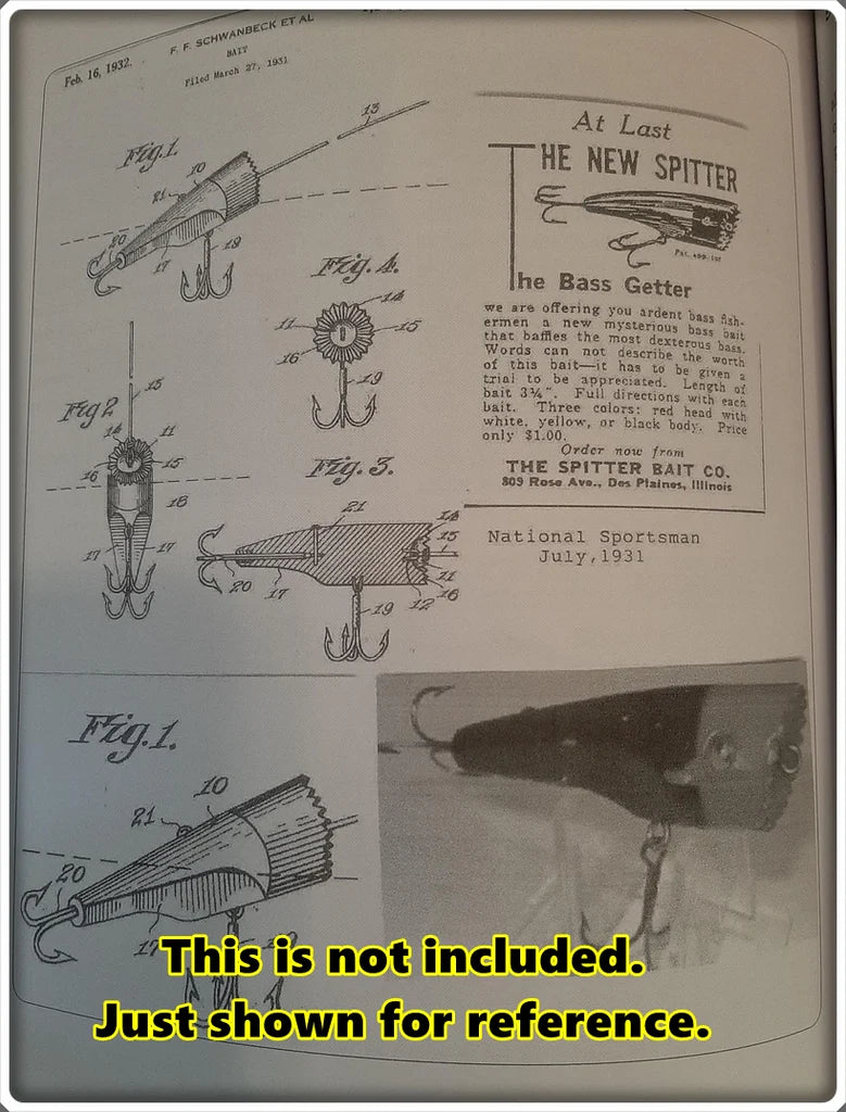 This is a nice old The Spitter Bait Co Yellow & Red Bass Getter lure that was sold on Tough Lures! Vintage and antique fishing lures are added for sale often so keep checking back! I buy old lures so feel free to contact me if you have any to sell.